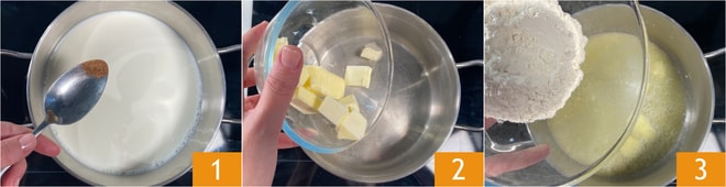 Para preparar as lasanhas com acelga, primeiro cuide do molho bechamel: coloque o leite em uma panela, adicione a noz-moscada 1 e o sal, depois aqueça. Derreta a manteiga em fogo baixo em outra panela 2. Adicione a farinha de uma vez só 3.