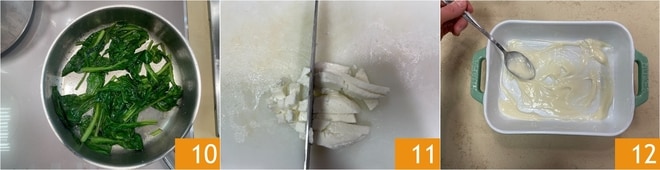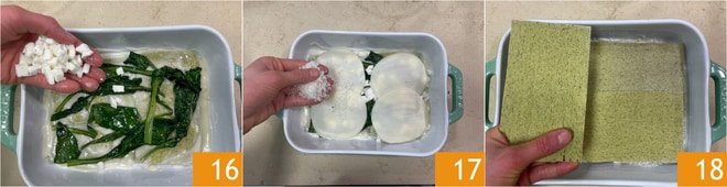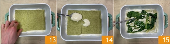 Coloque as folhas de massa verde 13 e depois outra camada de molho bechamel 14. Distribua agora uma parte da acelga cozida 15.