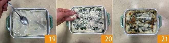 A última camada será composta por molho bechamel 19, acelga, mussarela e queijos ralados 20, então sem provolone. Asse em forno estático pré-aquecido a 190° por 35 minutos. Retire do forno a lasanha com acelga e deixe esfriar antes de servir 21!