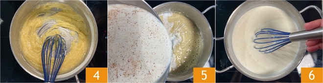 Misture vigorosamente com um batedor de mão até obter uma mistura dourada, o roux 4. Neste ponto, dilua o roux adicionando primeiro um pouco de leite quente e depois o restante 5. Continue mexendo em fogo baixo até que o molho bechamel engrosse 6. Deixe o molho esfriar.