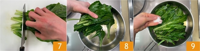 Limpe os vegetais cortando a base dos talos 7. Em uma panela, aqueça um fio de óleo, coloque a acelga 8 e tempere com sal 9 e pimenta.