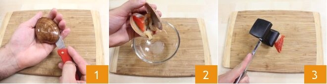 Para preparar as lasanhas com fasolari, comece pela limpeza dos fasolari. Abra-os passando a lâmina entre as conchas 1, recolha a água contida na concha em uma tigelinha 2 e retire o fruto. Coloque-o em uma tábua de cortar e, com um martelo de carne, bata cada fasolari, insistindo no pé (a parte vermelha) mais dura e calosa, até que ceda amolecendo 3.