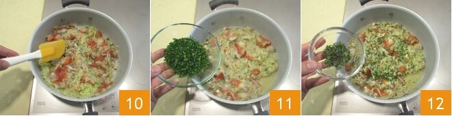 Cozinhe-os por 2 minutos em fogo alto 10, apenas o tempo suficiente para evaporar o líquido em excesso. Adicione também metade da cebolinha picada 13, metade do tomilho 12 e cozinhe por mais alguns minutos.