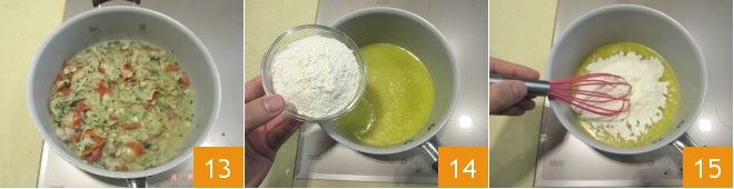 Misture, desligue o fogo e reserve 13. Dedique-se ao molho bechamel: comece pelo roux; em uma panelinha, derreta a manteiga, desligue o fogo por um momento e adicione a farinha 14, mexendo energicamente para evitar a formação de grumos 15. Coloque de volta no fogo baixo.
