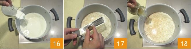 Em outra panela, despeje o leite 16 e adicione a noz-moscada 17 e 150 g da água de fasolari restante 18, leve ao fogo baixo até quase ferver,