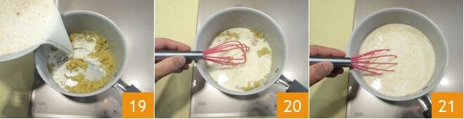 e despeje-o aos poucos sobre o roux de manteiga e farinha 19, que, entretanto, terá engrossado em fogo baixo, ficando com a cor de avelã. Mexa vigorosamente com um batedor 20, continuando até que, após 5-6 minutos, o molho bechamel engrosse 21.