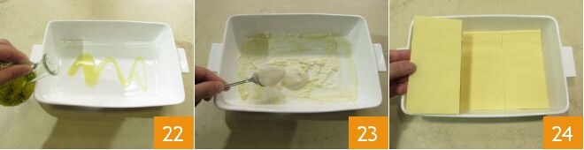 Agora você pode começar a montagem das suas lasanhas: unte com um fio de óleo (10 g) uma travessa de 20x30 cm 22 e depois espalhe algumas colheres de molho bechamel no fundo 23, espalhando uniformemente. Coloque agora uma primeira camada de lasanhas de ovos sobre a cama de bechamel 24, dispondo as folhas lado a lado.