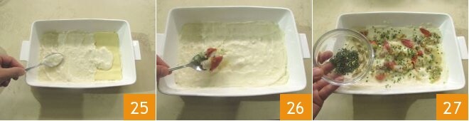 Continue agora espalhando uma fina camada de molho bechamel sobre as lasanhas de ovos 25, depois polvilhe com fasolari 26 e adicione uma pitada do restante de tomilho e cebolinha picada 27.