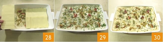 Cubra com outras folhas de lasanha 28 e continue da mesma forma até terminar os ingredientes, finalizando com uma camada descoberta 29. Suas lasanhas estão prontas para serem assadas por 20 minutos em forno estático pré-aquecido a 180°C. Finalmente, conclua o cozimento com mais 5 minutos na função grill, e suas lasanhas de fasolari estão prontas para serem saboreadas 30!
