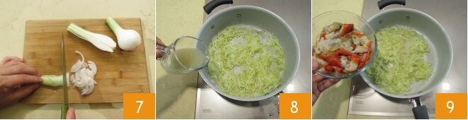 Limpe e lave as cebolinhas, corte-as ao meio no sentido do comprimento e depois em fatias finas 7. Doure o dente de alho descascado em uma panela com cerca de 30 g de óleo, e uma vez que esteja temperado, remova o dente e deixe as cebolinhas murcharem em fogo baixo por cerca de 15 minutos, regando com 30 g do suco de fasolari que você tinha reservado 8. Em seguida, adicione os fasolari 9.