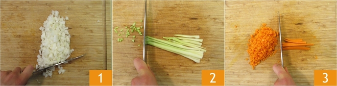 Para preparar as lasanhas da montanha, comece pelo ragù de linguiça: limpe e pique finamente a cebola 1, o aipo 2 e a cenoura 3.