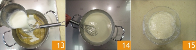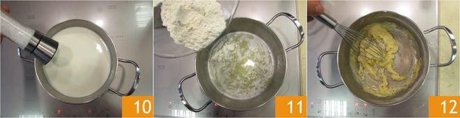 Adicione um pouco de leite quente 13, mexa e adicione o restante do leite. Cozinhe o molho bechamel por cerca de 5-6 minutos 14 até engrossar. Mantenha em temperatura ambiente coberto com filme plástico em contato 15.