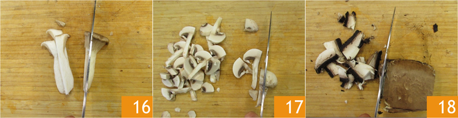 Cuide dos cogumelos: limpe os cogumelos raspando com uma faquinha a parte mais terrosa. Corte os chanterelles em fatias 16 e faça o mesmo com os champignons 17 e os portobellos 18.