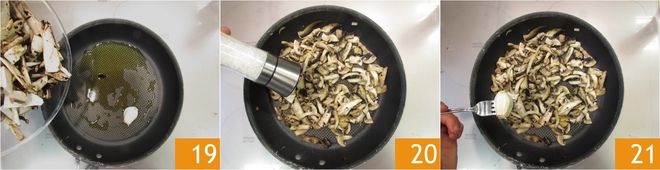 Aqueça um fio de azeite de oliva extra virgem em uma frigideira grande. Adicione o dente de alho, deixe pegar sabor. Coloque os cogumelos 19 e salteie na frigideira por 2-3 minutos, ou até cozinhar. Tempere com sal 20, retire o dente de alho 21.
