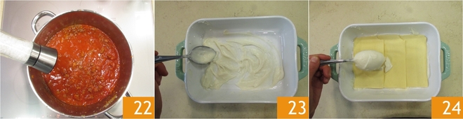 Enquanto isso, o ragù também estará pronto 22, ajuste o sal. Pegue uma travessa retangular (medidas 24 x 17 x 6), coloque uma primeira camada fina de molho bechamel 23, coloque 3 folhas de massa de lasanha por cima, sobrepondo-as ligeiramente, adicione uma camada de molho bechamel 24.