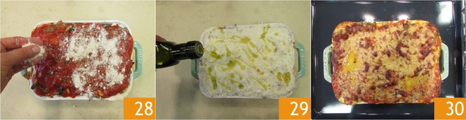 Cubra o ragù da última camada com o Parmigiano Reggiano DOP ralado 28. Regue com um fio de azeite 29. Asse em forno estático a 200 graus por 25 minutos, ao final ajuste para a função grill por 5 minutos para gratinar a superfície. Retire do forno 30 e deixe esfriar as lasanhas da montanha antes de servi-las.