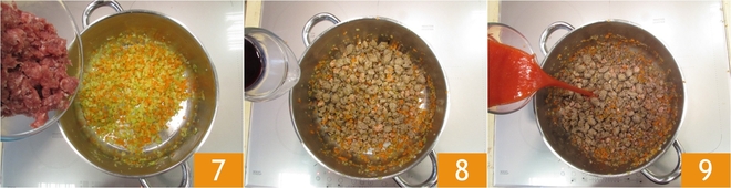 Adicione a linguiça esfarelada 7, doure em fogo médio por cerca de 5 minutos, mexendo frequentemente. Acrescente o vinho tinto 8 e deixe evaporar. Depois, adicione o molho de tomate 9, tempere com sal e cozinhe o ragù em fogo médio-baixo por cerca de 1 hora: você precisará obter uma consistência ligeiramente solta.