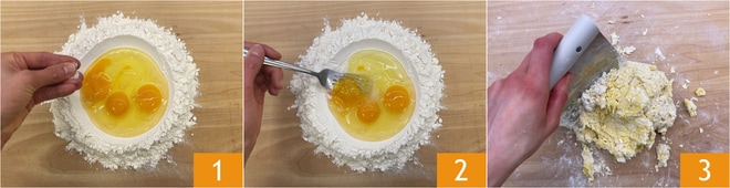 Para preparar as lasanhas ao pesto no micro-ondas, comece pela preparação da massa fresca: em uma superfície de trabalho, disponha a farinha em forma de montinho, quebre os ovos no centro, adicione uma pitada de sal 1 e bata rapidamente 2. Misture a massa auxiliando-se com uma espátula 3.