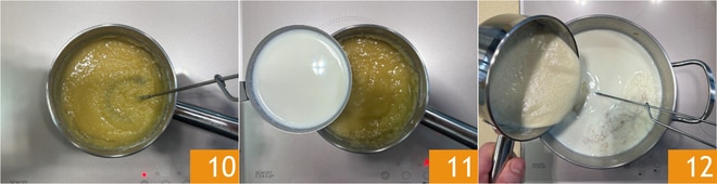 Misture no fogo médio com um batedor para evitar a formação de grumos 10. Quando obtiver um composto de cor marrom claro, adicione uma parte do leite quente para dissolver 11, misture e despeje tudo na parte restante do leite 12. Deixe cozinhar em fogo baixo até obter um molho viscoso, depois reserve.