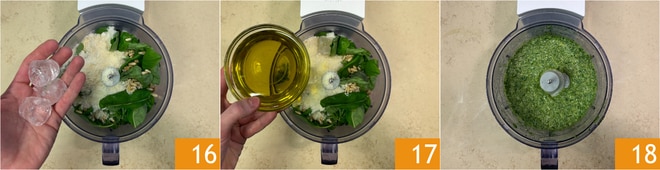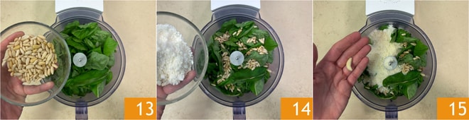 Finalmente, prepare o pesto: em um processador de alimentos, coloque o manjericão, depois adicione os pinhões 13, o parmesão, o pecorino 14 e o alho 15.
