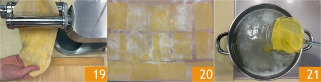 Retome a massa e divida para facilitar o manuseio. Abra a massa com a ajuda de uma máquina de macarrão 19, ajustando gradualmente a espessura até chegar a 1-2 mm. Corte as folhas em retângulos de 15x10 cm 20, depois escalde em água salgada 21.