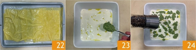 Disponha as folhas em uma assadeira levemente untada e deixe esfriar 22. Monte a lasanha em uma forma de 25x25 cm, distribuindo no fundo um fio de óleo e uma concha de molho bechamel, depois continue com o pesto 23 e adicione um pouco de pimenta 24.
