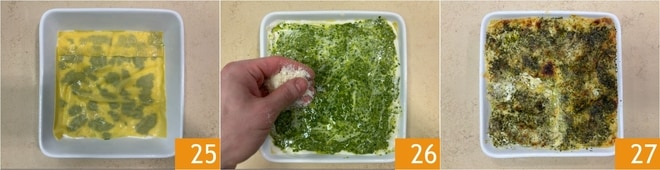 Coloque outra camada de folhas de massa 25 e continue da mesma forma até atingir um total de 5 camadas. Termine polvilhando a superfície com o parmesão 26. Cozinhe no micro-ondas a 500 W por 10 minutos, depois continue o cozimento por mais 5 minutos na função grill. As lasanhas ao pesto no micro-ondas estão prontas 27!