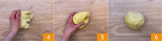 Continue trabalhando com as mãos 4 até obter uma massa lisa e homogênea 5. Cubra com filme plástico e deixe descansar na geladeira por 15 minutos 6.