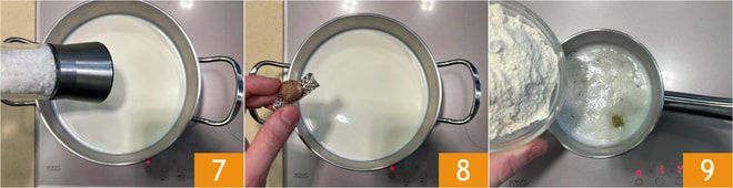 Passe para o molho bechamel. Aqueça o leite em uma panela, adicione o sal 7 e a noz-moscada 8. Em uma panela pequena, prepare o roux: derreta a manteiga cortada em pedaços grandes, depois adicione a farinha 9.