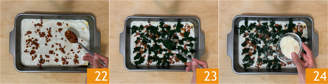 Monte a lasanha: em uma assadeira de 35 x 25 cm distribua no fundo algumas colheres de bechamel 19, continue com as camadas de massa seca 20, bechamel 21,
