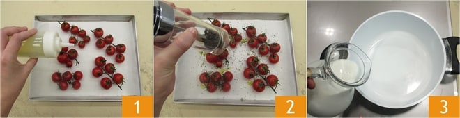 Para preparar a lasanha com abobrinha, tomates confit e linguiça, primeiro prepare os tomatinhos confit: lave os tomatinhos e coloque-os inteiros em uma assadeira forrada com papel manteiga. Tempere com óleo 1, sal, açúcar mascavo, raminhos de tomilho, orégano seco e pimenta a gosto 2. Asse em forno ventilado pré-aquecido a 140° por 120 minutos. Enquanto isso, prepare o molho bechamel: aqueça o leite em uma panela 3, depois adicione uma pitada de sal e noz-moscada.