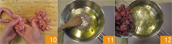 Retire a pele da linguiça e corte-a em pedaços com as mãos 10. Coloque um fio de óleo em uma panela grande e refogue a chalota em fogo baixo 11. Adicione a linguiça à panela 12 e refogue por alguns minutos.