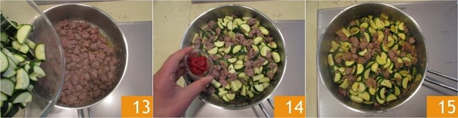 Adicione também as abobrinhas 13, acrescente o extrato de tomate 14, sal, pimenta e cozinhe por cerca de 8-10 minutos em fogo médio. Após esse tempo, desligue o fogo e reserve 15.