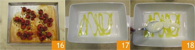 Enquanto isso, os tomatinhos estarão bem assados 16. Pegue uma assadeira de 20x30 cm, despeje um fio de óleo no fundo 17 e uma colher de sopa de molho bechamel 18.