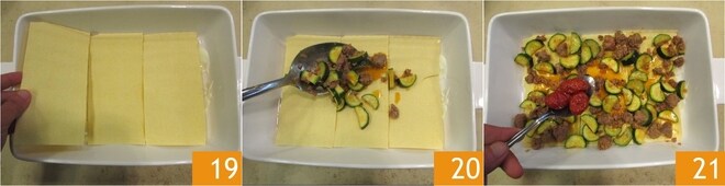 Agora coloque 3 das 12 folhas de massa seca 19 e cubra com parte do molho de linguiça e abobrinha 20. Distribua também os tomatinhos por cima 21.
