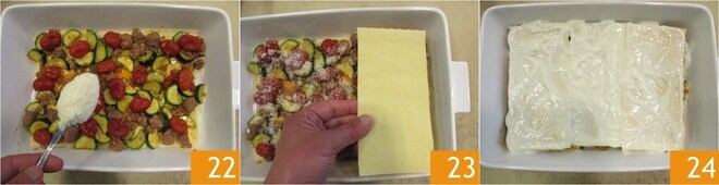 Tempere com uma colher de sopa de Grana ralado 22. Continue com outra camada de massa, molho bechamel, tomatinhos e Grana. Continue até terminar os ingredientes 24; com essas quantidades, você obterá 4 camadas no total.