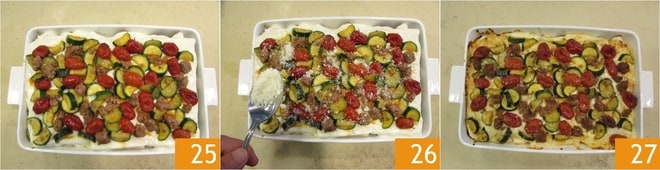 A última camada deve ser de molho bechamel, molho de abobrinha e linguiça, tomates e Grana 26. Asse em forno pré-aquecido a 200° por 25 minutos. Uma vez assadas, retire as lasanhas do forno e deixe esfriar um pouco antes de servir 27.