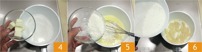 Sempre em uma panela, derreta a manteiga em fogo baixo 4, depois desligue o fogo e adicione toda a farinha de uma vez 5, mexendo com um batedor para evitar a formação de grumos. Volte ao fogo baixo e mexa até dourar. Incorpore o leite quente 6 e cozinhe por 5-6 minutos em fogo baixo.