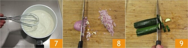 Continue mexendo com o batedor até que o molho bechamel engrosse 7. Agora prepare o molho: pique finamente uma chalota 8, lave e corte as abobrinhas ao meio no sentido do comprimento, depois corte-as em fatias de cerca de 1 cm de espessura 9.