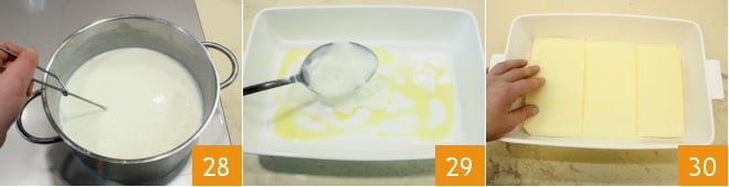 Continue a mexer com o batedor para engrossar o molho bechamel em fogo baixo 28. Pegue uma assadeira de 30x20 cm e regue com um fio de azeite; distribua uma camada de molho bechamel 29 e acomode uma camada de lasanha 30.