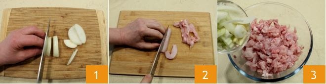 Você pode diluí-los com um pouco de caldo de carne 10 para facilitar o cozimento, mas eles devem cozinhar por poucos minutos, permanecendo crocantes; ajuste o sal e a pimenta, adicione a salsa picada 11, misture e desligue o fogo. Agora prepare o ragu de coelho: pegue a cebola, a metade do talo de aipo e uma cenoura 12 para picá-los finamente.