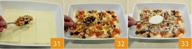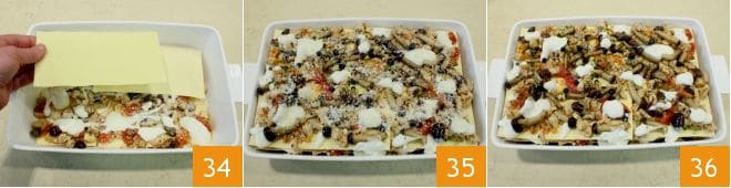 Tempere com uma camada de ragu de coelho 31, uma de cogumelos 32, depois continue polvilhando o Parmesão ralado e algumas colheres de molho bechamel 33.