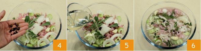 as folhas de sálvia, os ramos de alecrim, as folhas de tomilho, as bagas de zimbro 4; depois cubra tudo com o vinho branco 5 e deixe marinar por pelo menos duas horas ou a noite toda 6, coberto com filme plástico e na geladeira.