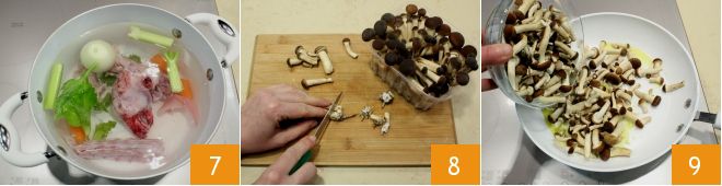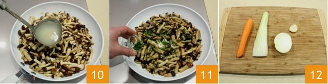 Para preparar o caldo, despeje a água em uma panela, depois adicione os ossos do coelho, a cebola, o aipo, a cenoura e uma pitada de sal: deixe ferver em fogo baixíssimo por pelo menos 1 hora. Enquanto isso, dedique-se aos cogumelos: limpe os cogumelos cortando a parte final 8, lave-os; depois escalde-os por 15-20 minutos antes de despejá-los em uma frigideira grande onde você terá refogado ligeiramente o alho picado com um fio de azeite 9.