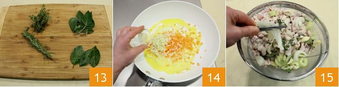 Faça a mesma operação também com alho, sálvia, tomilho, louro, alecrim 13. Regue com um fio de azeite uma frigideira grande, depois adicione a mistura de cebola, aipo e cenoura e o dente de alho 14 e refogue a base em fogo baixo. Escorra cuidadosamente o coelho da marinada, retire os aromas 15.