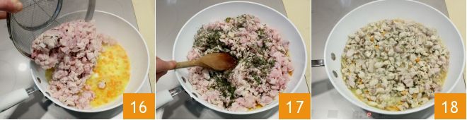 Quando a base estiver murcha, adicione o coelho 16 e as ervas aromáticas picadas 17, em seguida, refogue por 10-15 minutos 18.