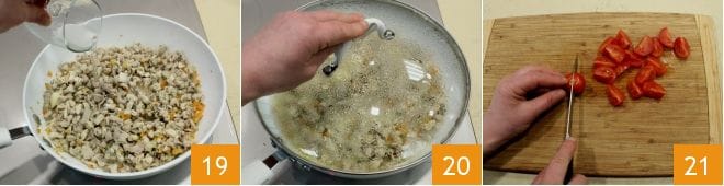 Regue a carne com o vinho branco 19, deixe evaporar, depois adicione o caldo de coelho de vez em quando, cozinhando com a tampa 20, até que a carne fique bem macia: levará cerca de 1 hora. Perto do final do cozimento, lave e corte em gomos os tomates cereja 21,