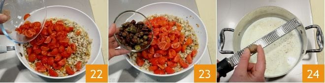 adicione-os ao ragu de coelho 22, depois adicione também as azeitonas taggiasche sem caroço 23. Ajuste o sal e a pimenta e depois desligue o fogo. Em seguida, dedique-se ao molho bechamel: em uma panela, aqueça o leite, aromatize-o com a noz-moscada ralada 24 e adicione sal e pimenta a gosto.