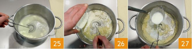 Em outra panela grande, despeje a manteiga e derreta em fogo baixo 25; uma vez derretida, despeje a farinha em chuva 26 e misture com um batedor para criar o roux. Quando a mistura estiver levemente escurecida e ficar mais densa, despeje o leite quente 27.