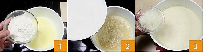 Para preparar a lasanha de aspargos e raspadura, primeiro prepare o molho bechamel; derreta a manteiga e peneire a farinha suavemente para criar o roux 1, mexendo com um batedor manual. Adicione o leite levemente aquecido e misture até que espesse 2; salgue e tempere com noz-moscada. No final da preparação, com o fogo desligado, incorpore o queijo pecorino e misture bem 3.